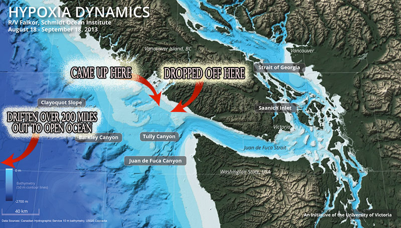 Meanwhile the current pushed us out to open sea into shipping lanes so we were basically headed for Japan and there was nothing we could do about it, completely helpless and we also lost sight of the coast line or land, put it this way, Japan is 4,700 miles away and simply open ocean. Now in the ocean for nearly 13 hrs. total, 1 hr. for our dive, 2 hours lost by the captain, and 10 hrs. to find us. What we went through during those long hours is an horrific story in itself. Then out of the blue, and what seemed to be an eternity, a Canadian commercial fishing boat just happened to spot us as they were coming back from fishing, they heard the coast guard distress call over the airwaves about us, so they were keeping there eyes open, one of there crew in the tower of there ship, with binoculars spotted us, he told the captain 'this Quote'.