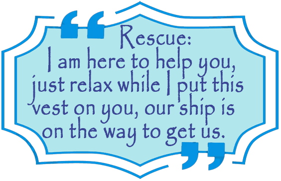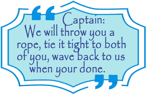Tom first said 'Quote', and the boat's horn was getting loader and loader as they got closer, so we started to look around when we were at the top of each swell as the waves pushed us up and down, once we saw the actual ship coming, it was at that moment we knew for sure we were getting rescued, because someone has seen us, in our minds, it was truly a miracle they spotted us in such a rough nasty ocean, guess we are meant to be here afterall, our lives were just givin' back to us, rather than our lives being taken away from us. Once the ship got closer or near us, the Captain said over the load PA system to us 'Captain's Message. They threw us a rope with a boey, then two shorter ropes attached to the boey for each of us to tie ourselves too. This one day's event was so powerful it changed us forever.
